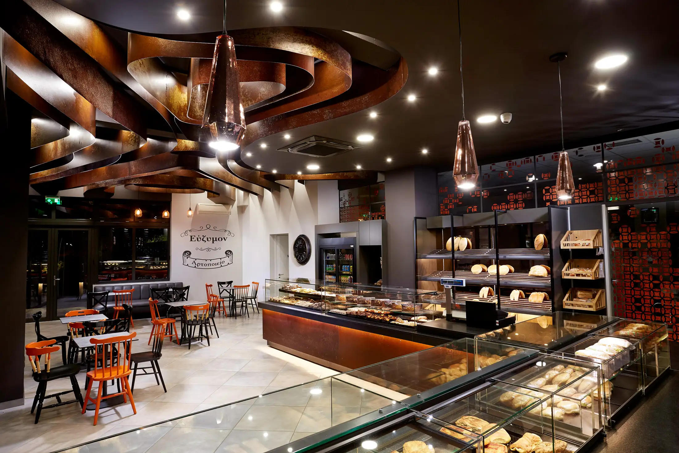 Efzymon is a contemporary bakery in Karpenisi, designed by a+ architects. The space is defined by clean lines, detailing and a clear spatial flow that shapes the customer experience from entrance to counter.